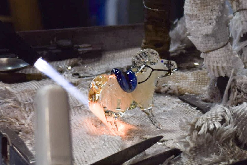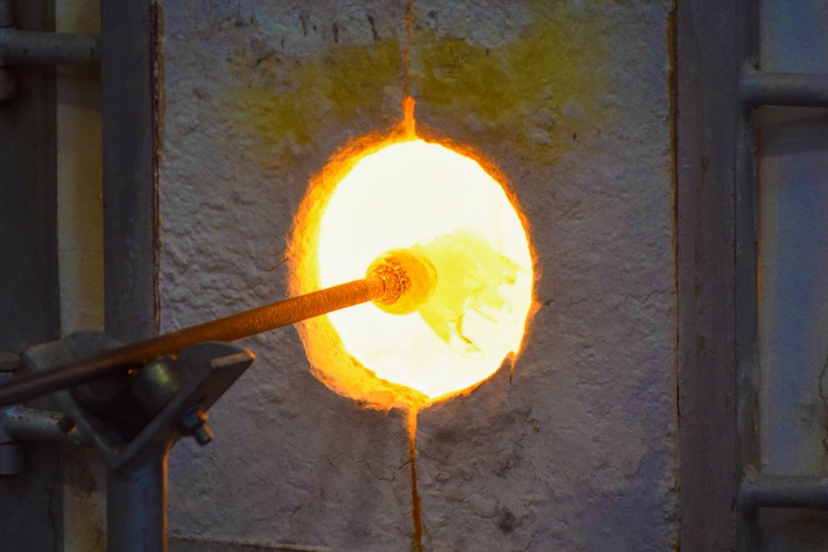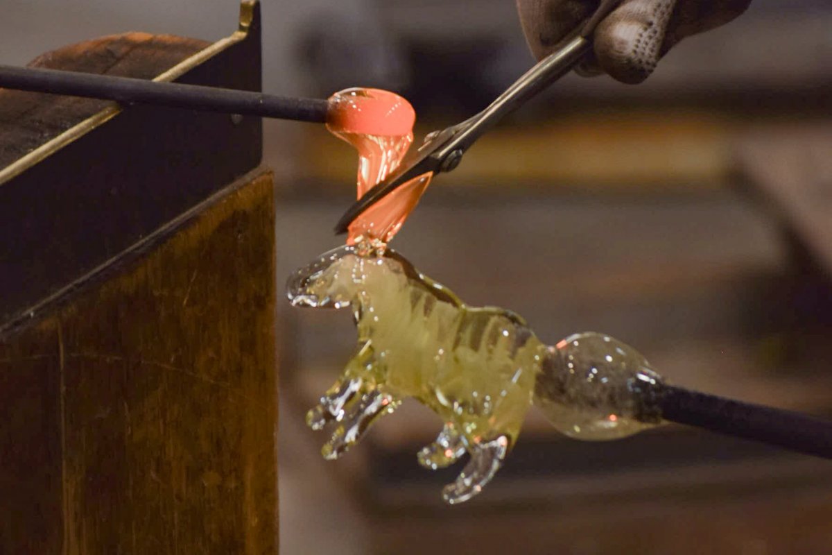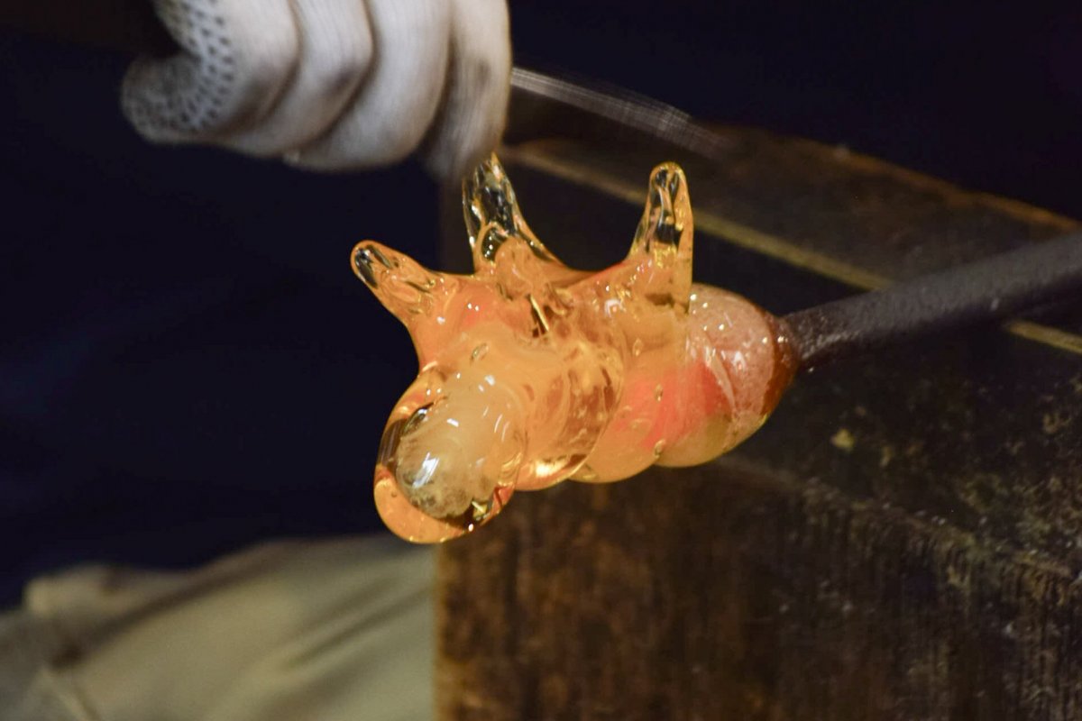 真っ赤に溶けたガラスは、金属の棒に巻き取られ、少しずつ形を整えながら、ひとつの作品へと姿を変えていきます。