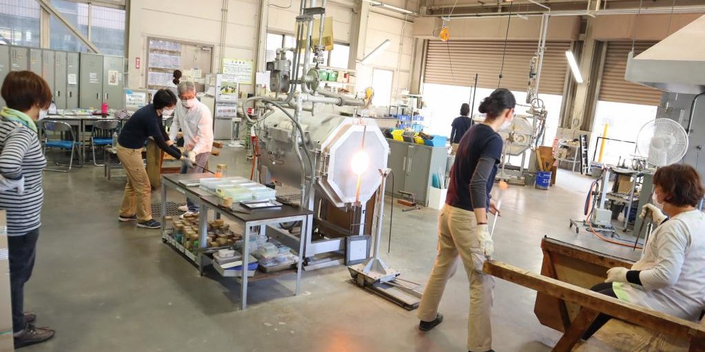 工房では、溶けたガラスに息を吹き込む「吹きガラス体験」などのホットワーク(溶けたガラスでの体験)のほか、ガラスをカットして重ね、電気炉で焼成する「フュージング体験」など、だれでも楽しめる体験も実施しています。(すべて予約必須)