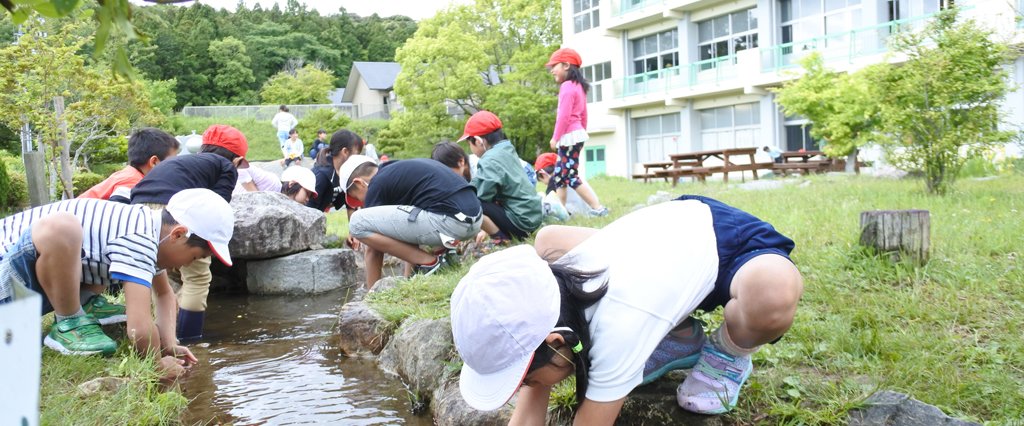 さて、取材でおじゃました日は運動場がぬかるんでいるため使用禁止。そのせいなのか、2時間目と3時間目の間の休み時間になると、外で遊びたい子どもたちがビオ竜谷に一斉に集まってきました。水路に草花を流して追いかけたり、水の中に腕を突っ込んで生き物を捕まえようとしたり、この後も授業があるというのに元気いっぱい。何を捕まえているの?と聞くと、「ドジョウだよ!」とのこと。「あっちだ!「こっちだ!」と声を掛け合い、低学年も高学年も関係なく一緒に遊んでいました。